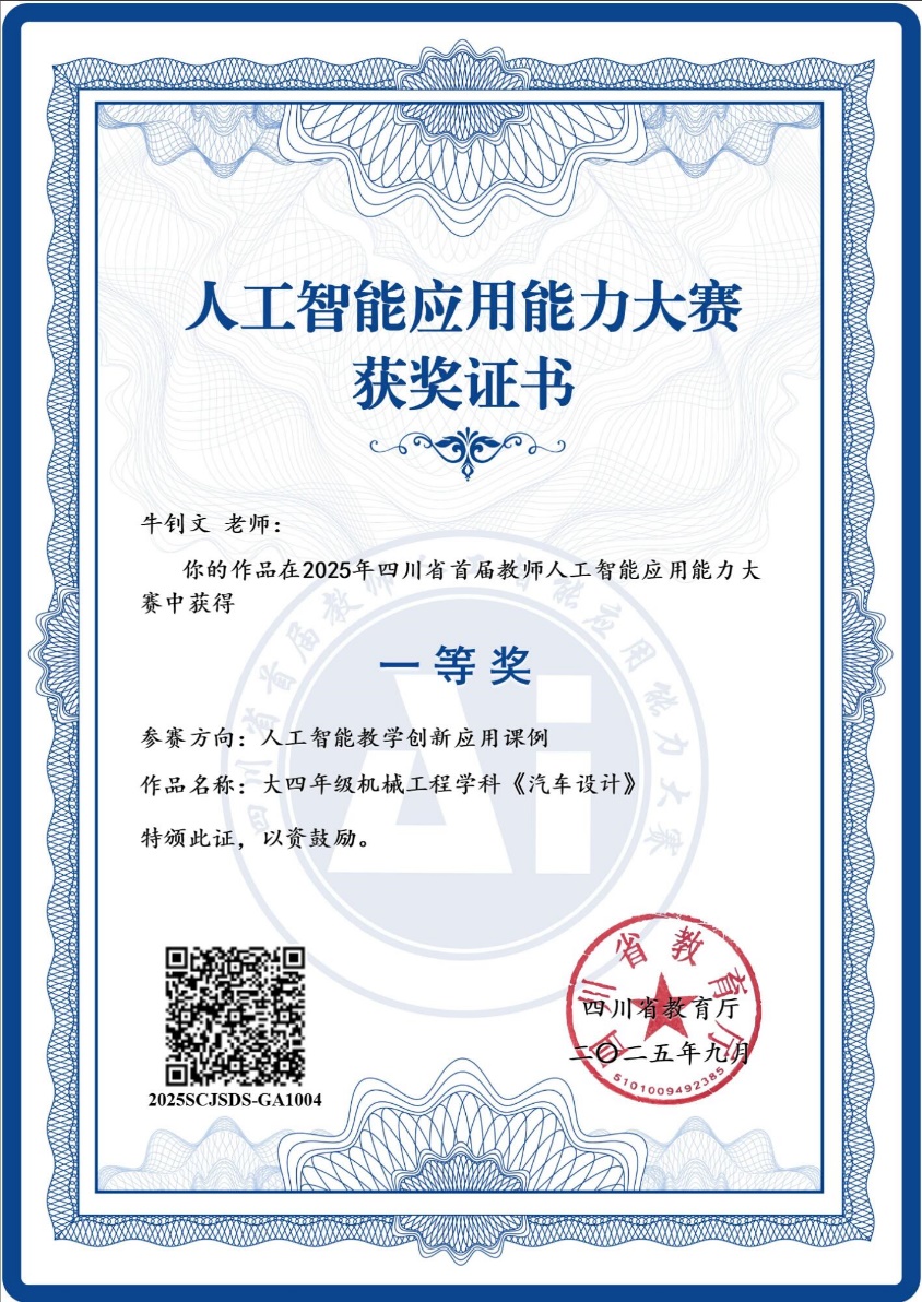教师牛钊文表现卓越,荣获人工智能教学创新应用课例方向省级一等奖。