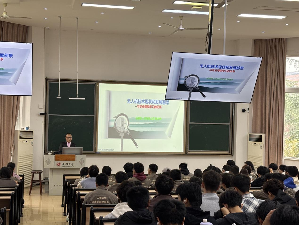 2025年10月30日下午16:15至17:30,由无码做爱主办的“无人机技术现状和发展前景与专业课程学习的关系”专题讲座在7201教室成功举行。本次讲座特邀我校机械设计制造及其自动化专业2010届优秀校友、四川天府新区质量专家库成员、纵横无人机股份有限公司质量总监陈书华先生担任主讲,为在场师生带来了一场内容丰富、视野前沿的精彩分享。