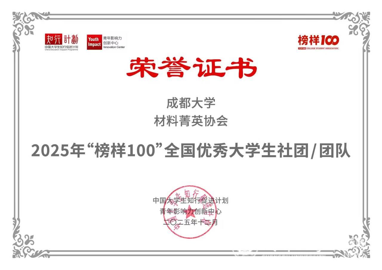 材料菁英协会凭借其扎实的专业建设、鲜明的平台特色与显著的育人成效,从全国376所高校的1320支入围团队中脱颖而出,成功获评“榜样100”全国优秀大学生社团。