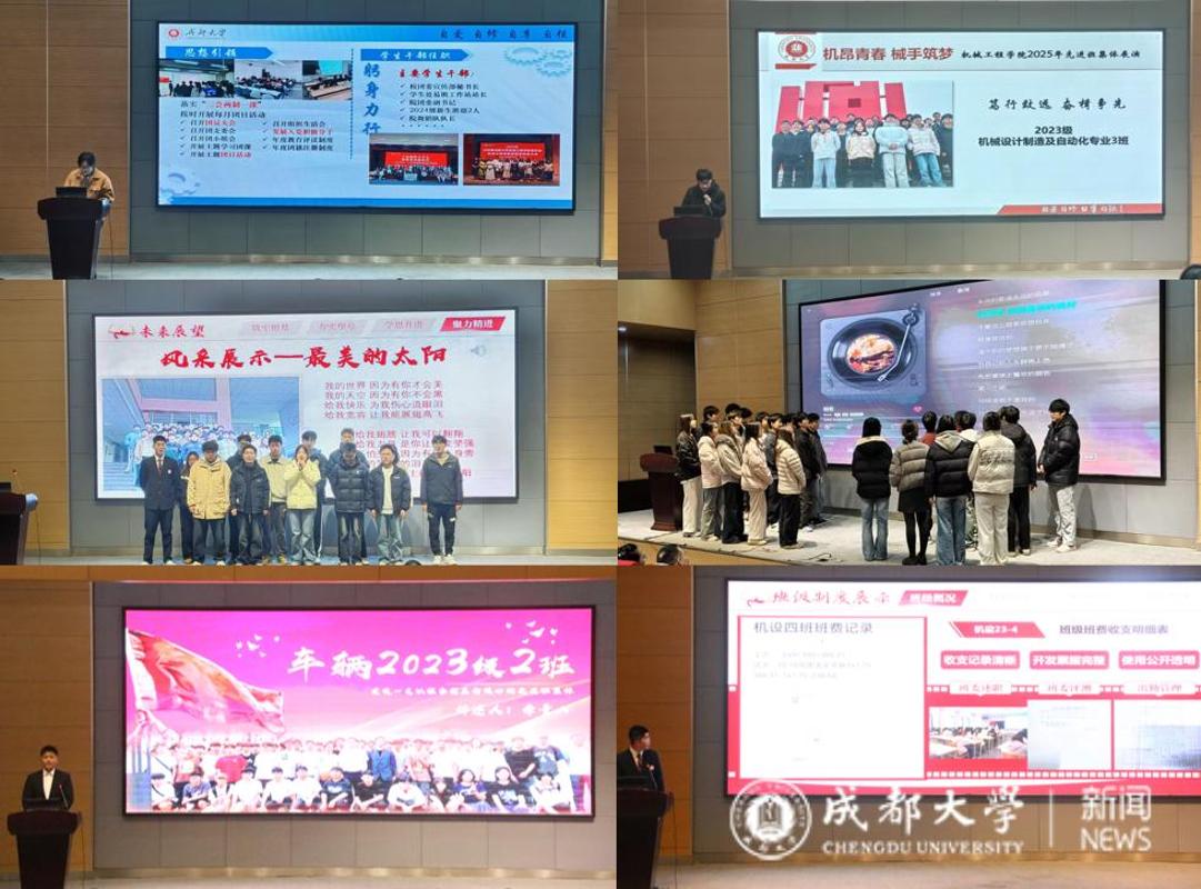 活动现场,获评本年度优秀班集体依次登台汇报展示。各班级聚焦思想建设成果,展现出青年学子积极向党组织靠拢的坚定信念。以精准详实的统计数据,彰显机械学子践行社会责任、投身公益实践的责任担当。通过图文结合、视频展播等多元形式,全面梳理班级在学科竞赛、文体活动、科研创新等领域的丰硕成果,系统介绍班级成员在学院学生会、社团联合会等学生组织中的任职情况,凸显集体成员全面发展、勇于奉献的综合素养。各班级的亮眼成绩与良好风貌赢得了在场师生的阵阵掌声。