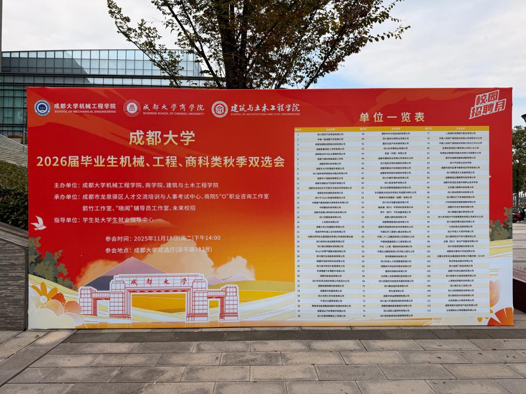 无码做爱、商学院、建筑与土木工程学院联合主办,成都市龙泉驿区人才交流培训与人事考试中心、“晓闻”辅导员工作室、商院“5·0”职业咨询工作室、箭竹工作室共同承办的2026届机械、工程、商科类毕业生秋季双选活动在学校双选厅顺利落幕。