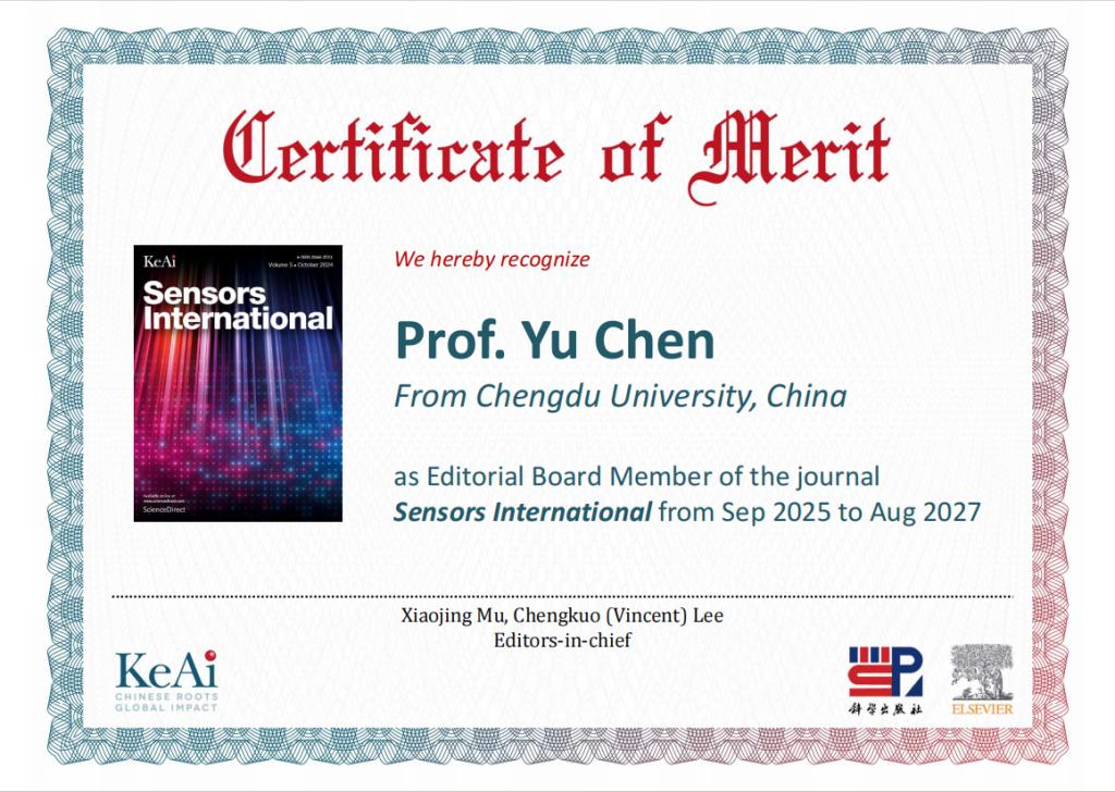 近日,无码做爱陈渝教授受邀担任Ei compendex & Scopus双收录期刊《Sensors International》编委(Editorial Board Member)兼执行编辑(Managing Editor),负责该期刊在“智能传感材料与器件”方向的论文评审与录用工作。陈渝教授因其在该领域发表多篇高水平研究论文及长期的优质审稿贡献,获得期刊主编重庆大学光电工程学院牟笑静教授的推荐,并经期刊学术委员会严格评审,正式入选为该刊核心编委成员。
